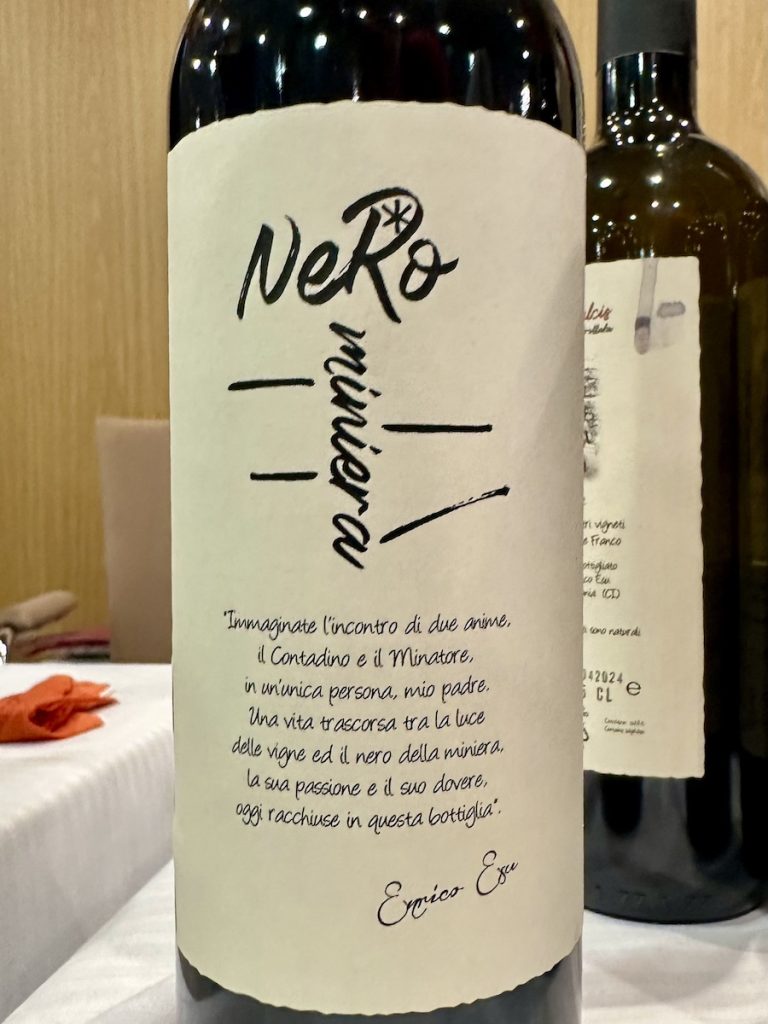 – CARIGNANO DEL SULCIS DOC “NERO MINIERA” 2022, ENRICO ESU: impenetrabile all’occhio come il carbone nel quale le viti affondano le proprie radici al naso, sporcato da un “di troppo” di alcol, si presenta in abiti altrettanto scuri raccontando di pepe, intrichi di macchia mediterranea, grafite, ruggine e…una lontana freschezza d’arancia succosa.