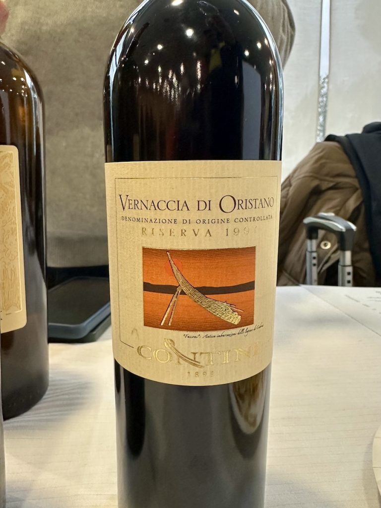 – VERNACCIA DI ORISTANO DOC 1997 RISERVA, CONTINI: un profluvio di frutta secca rinfrescata da folate mandorlate, una nube d’arancia candita che qua e là ricorda le bucce dell’agrume poste sull’economica, profondi graffi iodati, macchia mediterranea ed erbe aromatiche.