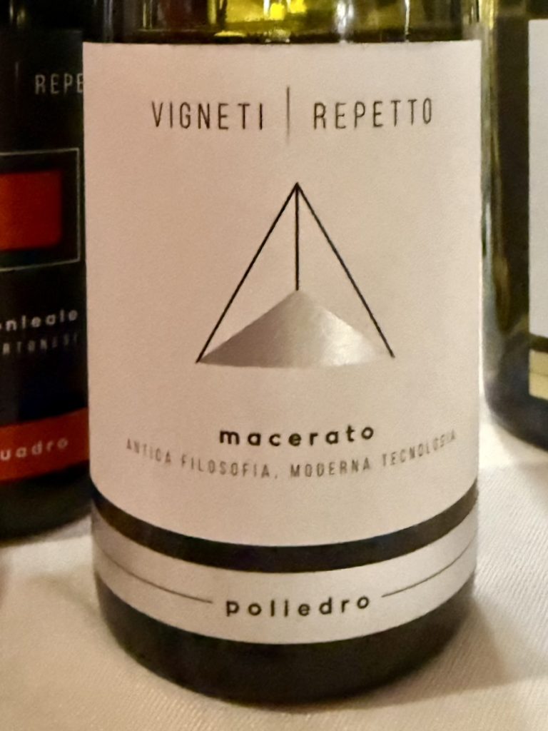 – VINO BIANCO MACERATO “POLIEDRO” 2021, VIGNETI REPETTO: non sono un fan dei vini macerati ma qui armonia e complessità si danno di gomito proponendoci un naso di mela cotogna, albicocca matura, zafferano, camomilla, pasta di mandorle, erbe aromatiche, miele, un balsamico che vuole sgattaiolare fuori…