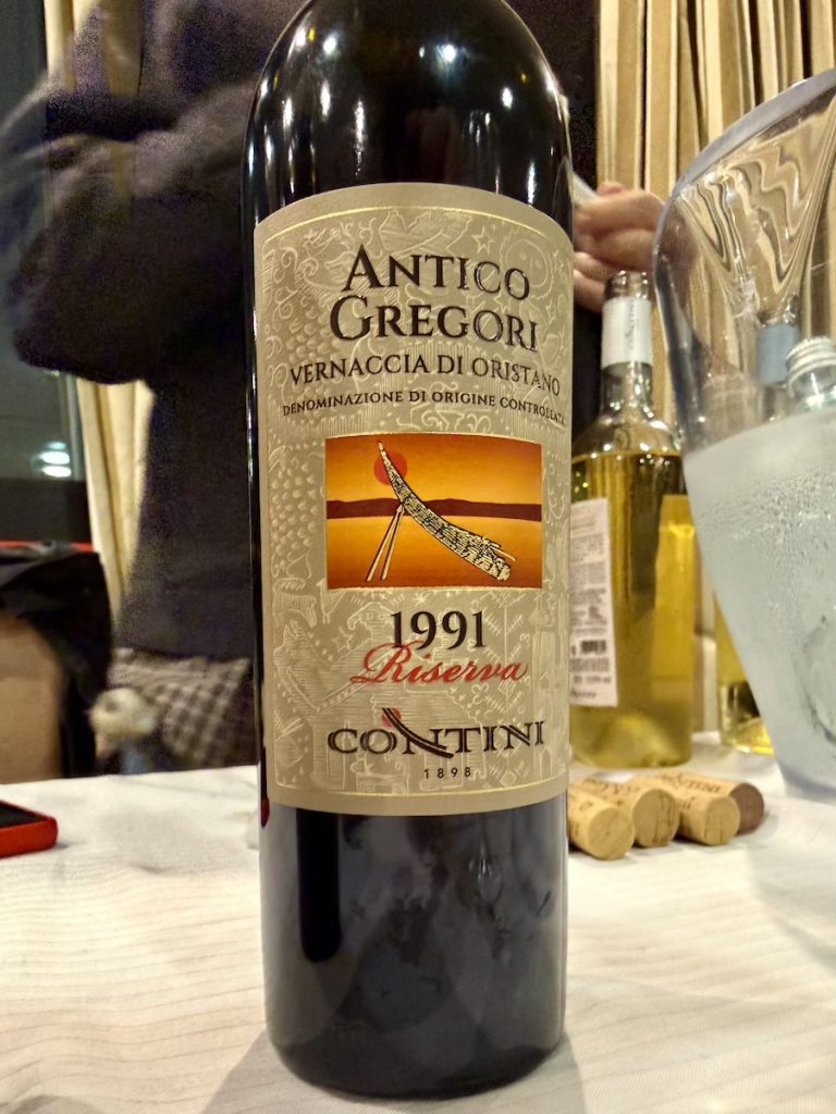 – VERNACCIA DI ORISTANO DOC “ANTICO GREGORI” 1991 RISERVA, CONTINI: olfatto complesso che vede sfidarsi dolcezze di miele e ridondanze di dattero con amaritudini di mallo di noce, accenni sapidi di arachide con grassezze pasticcere di cioccolato bianco e caramella mou.
