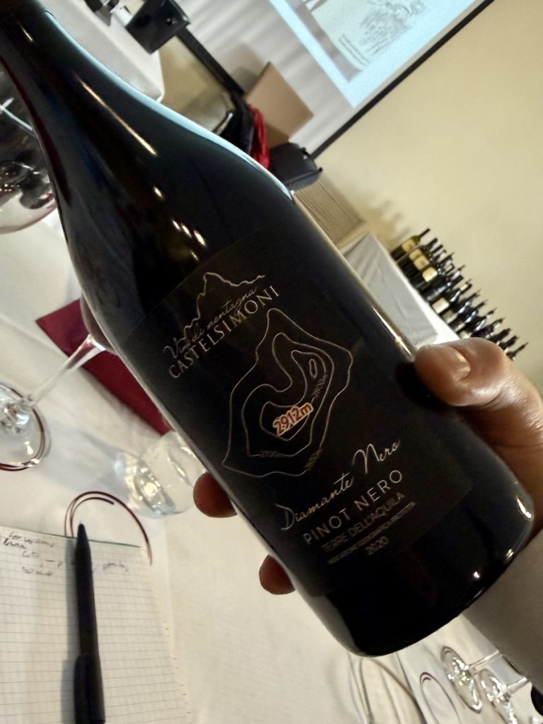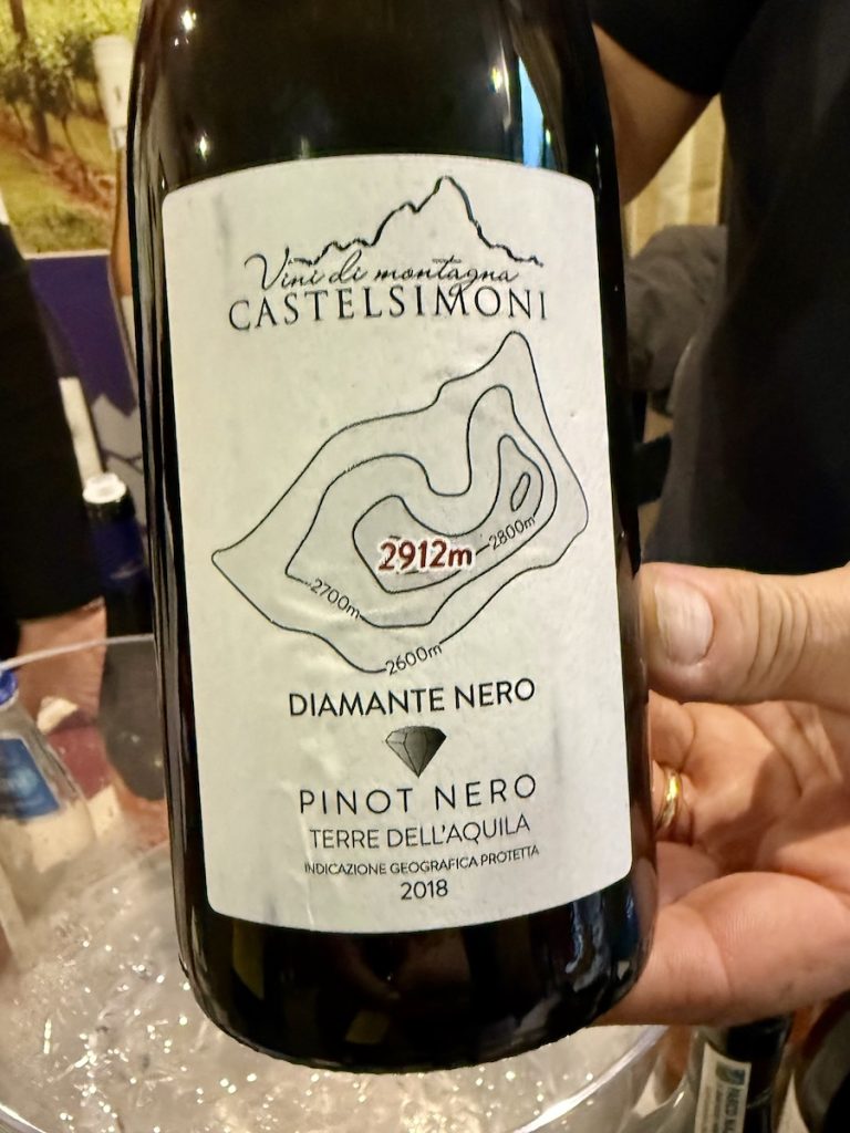 – ABRUZZO DOC PINOT NERO “DIAMANTE NERO” 2018 RISERVA, CASTELSIMONI (ABRUZZO): a un anno di distanza sembra essere salito di rango e, svestito il kilt ha ricevuto le insegne di cavaliere.