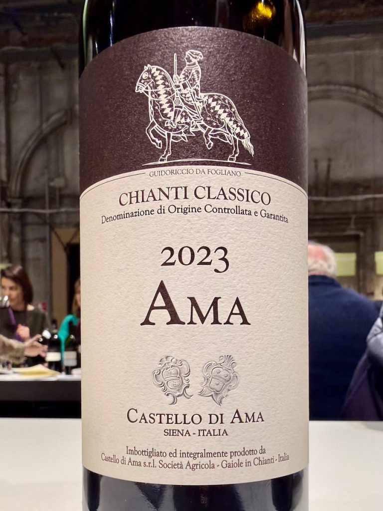 – CHIANTI CLASSICO DOCG 2023, CASTELLO DI AMA: netta l’introduzione balsamico-mentolata, seguita da guizzi pepati che stuzzicano e acchiappano e netto il colore rosso di piccoli frutti che vanno via via addolcendosi: visciole, amarene, ciliegie…
