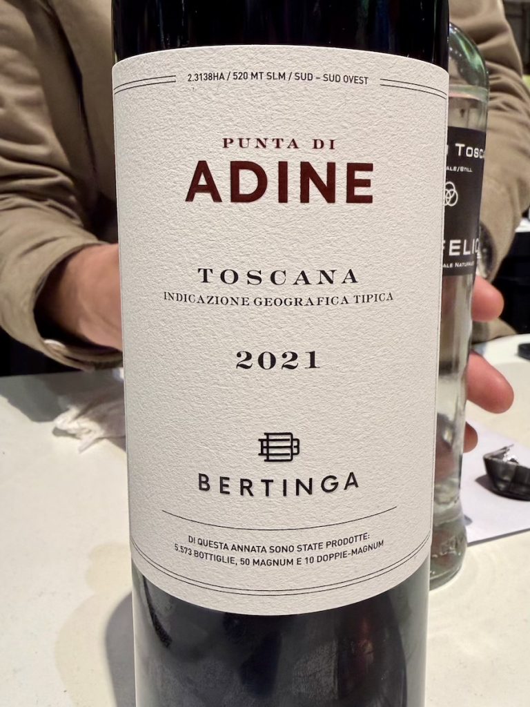 – TOSCANA IGT ROSSO “PUNTA DI ADINE” 2021, BERTINGA: ne stia alla larga chi cerca il Sangiovese imbellettato e ciliegioso.