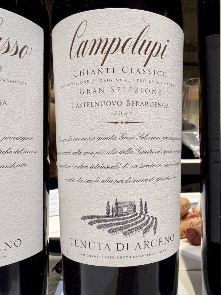 – CHIANTI CLASSICO DOCG GRAN SELEZIONE “CAMPOLUPI” 2023, TENUTA DI ARCENO: cupo e balsamico racconta boschi e spezie d’Oriente, decisa la viola, morbida la prugna, il pepe che fa rialzare la testa a un olfatto distratto da sottili tostature di quasi caffellatte.